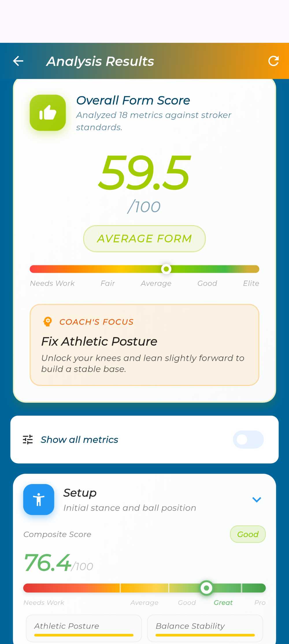 Receive a composite score, per-phase breakdown, Coach's Focus tip, and color-coded metrics instantly.